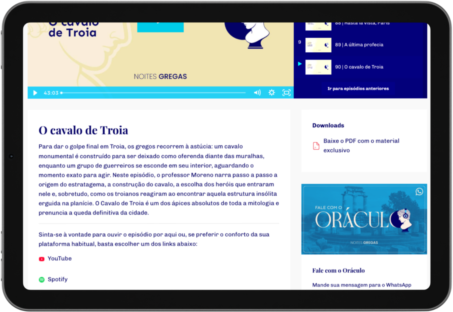 Ao assinar o Plano Heróis ou o Plano Deuses, você ganha acesso imediato a materiais exclusivos selecionados pelo professor Moreno: textos clássicos, textos de autoria do próprio professor, ensaios de estudiosos contempoâneos, traduções feitas na "cozinha" do podcast, e dezenas de imagens que decifram a história gravada em esculturas, pinturas e cerâmicas antigas. São mais de 300 materiais, que transformam cada episódio em uma experiência completa de escuta, leitura e contemplação.